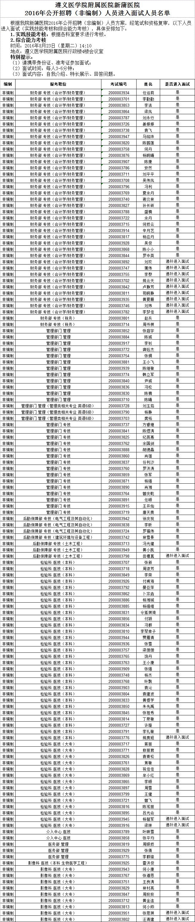 遵义医学院附属医院新蒲医院2016年公开招聘(非编制)人员进入面试人员名单