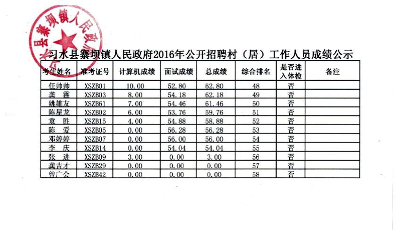 习水县寨坝镇人民政府2016年面向社会公开招聘村(居)工作人员成绩公示