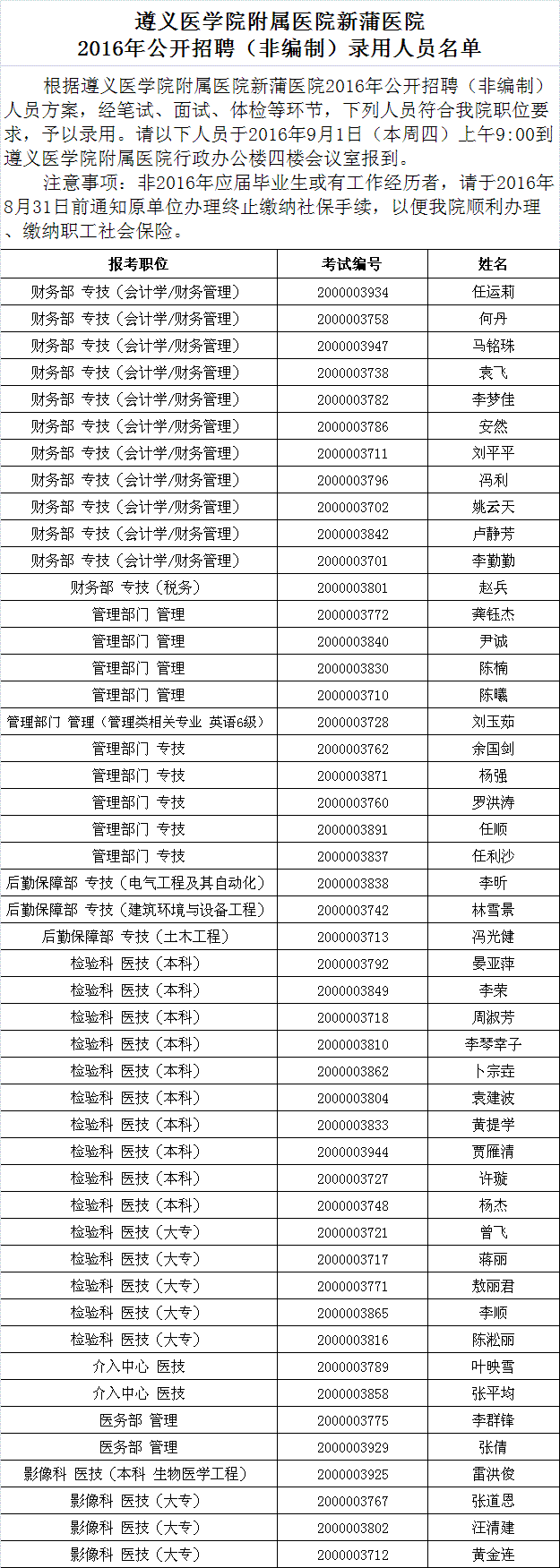 遵义医学院附属医院新蒲医院2016年公开招聘(非编制)录用人员名单