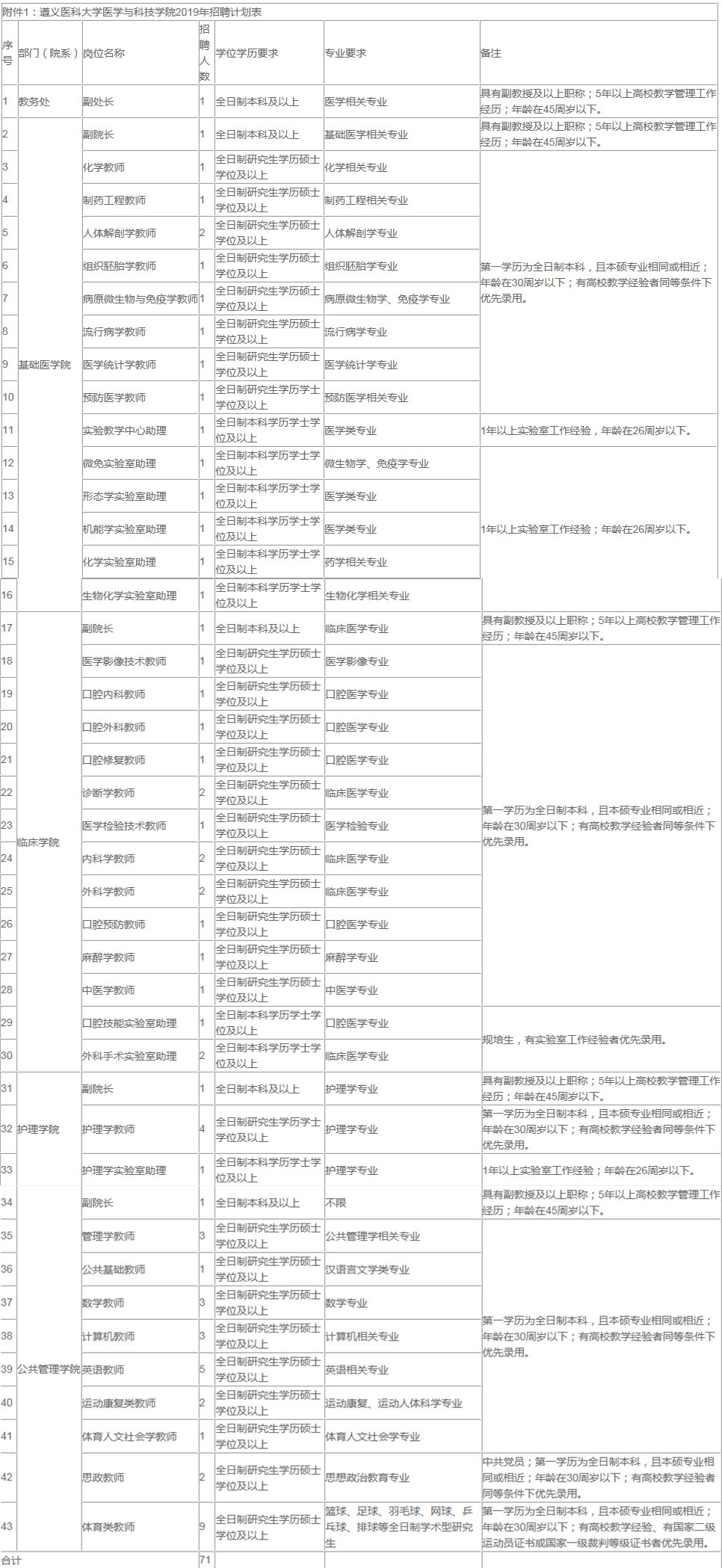 一、招聘计划:共71人,具体条件详见附件1:《遵义医科大学医学与科技学院2019年招聘计划表》。