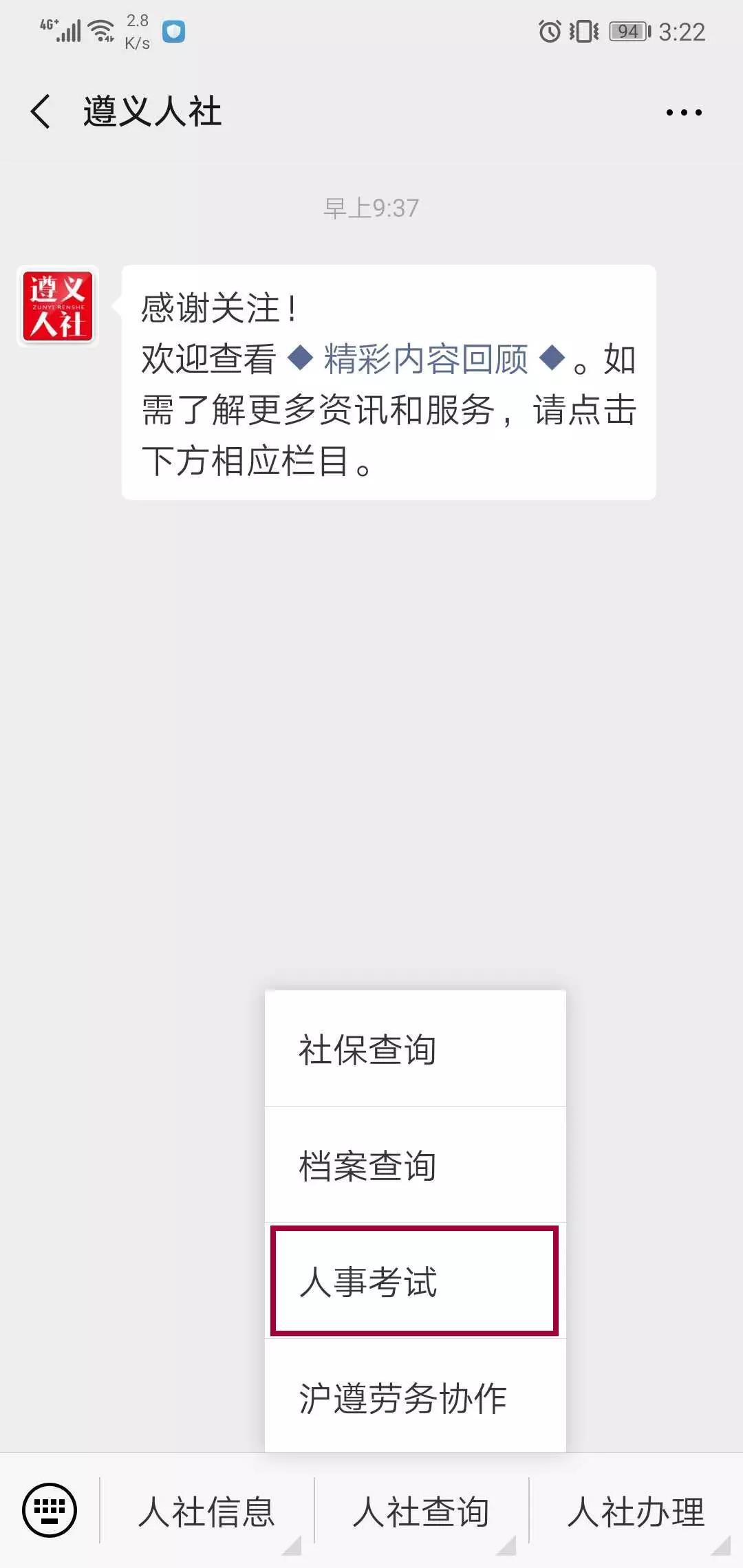 1.打开微信搜索并关注“遵义人社”官方微信公众号,点击人社查询内的人事考试模块。