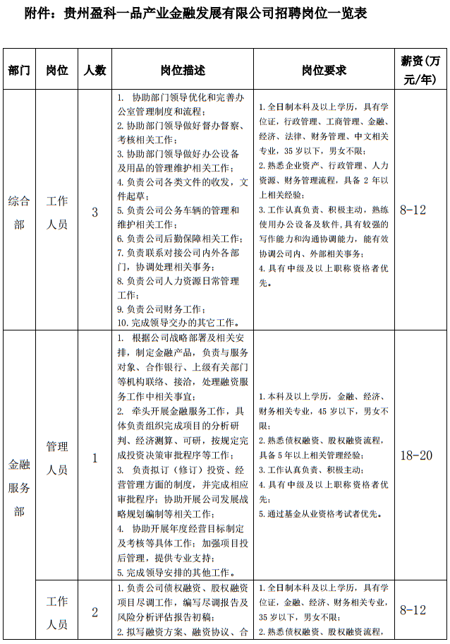 附件:贵州盈科一品产业金融发展有限公司招聘岗位一览表