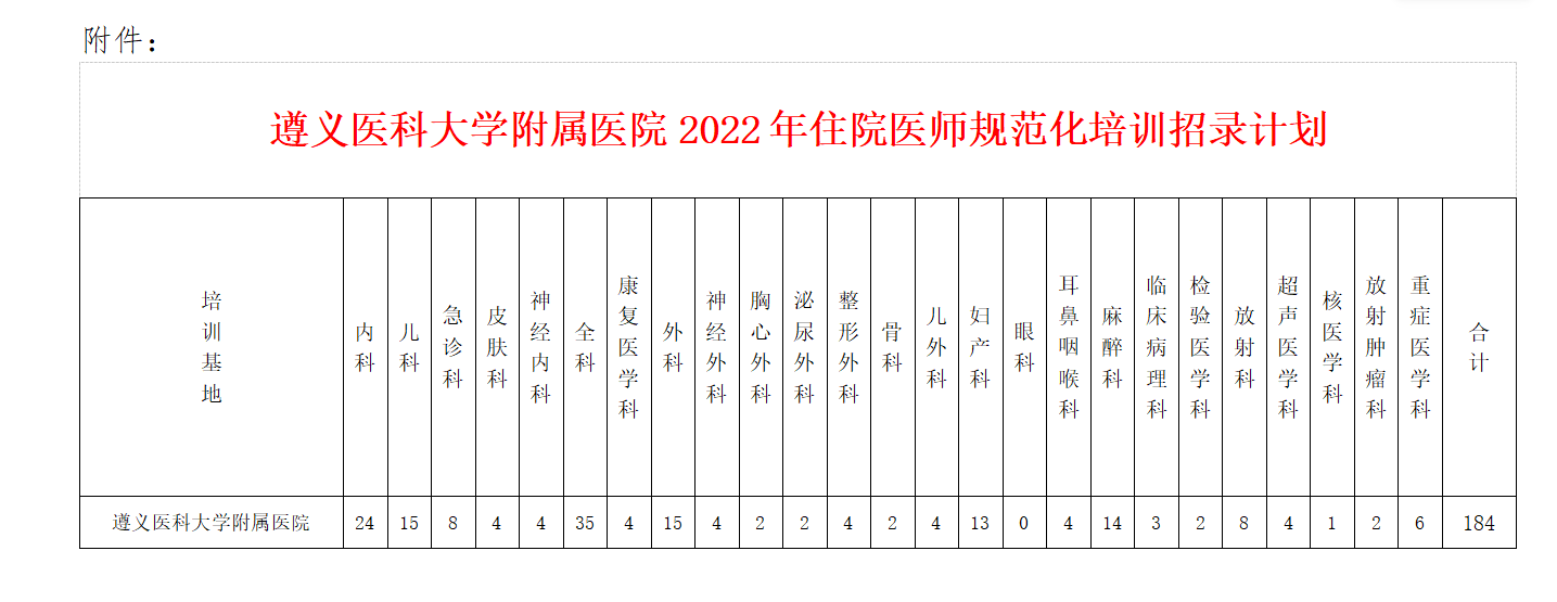原文件下载:遵义医科大学附属医院2022年住院医师规范化培训招录简章